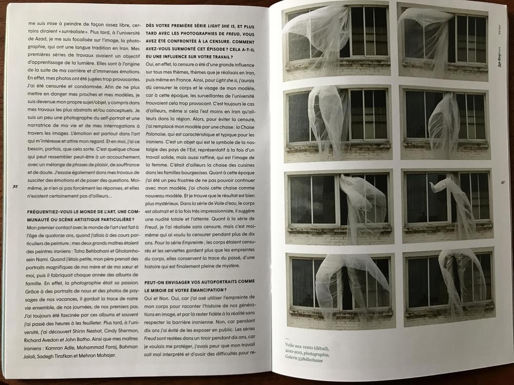 "De sa jeunesse iranienne, de sa quête d’identité à celle de la mémoire familiale, de son exploration de la figure féminine à son attachement au respect des droits des femmes, de tout cela la photographe Niloufar Banisadr en a fait la matrice de son œuvre. Une œuvre sensorielle, mémorielle, parfois transgressive à appréhender comme un journal où l’émotion prime et d’où surgissent mille et une interrogations. Comme des chapitres, ses autoportraits et séries photographiques de Light She Is à Lettre de Mado viennent compléter, chacun à leur manière, la réflexion de l’artiste sur l’intime et l’universel."
